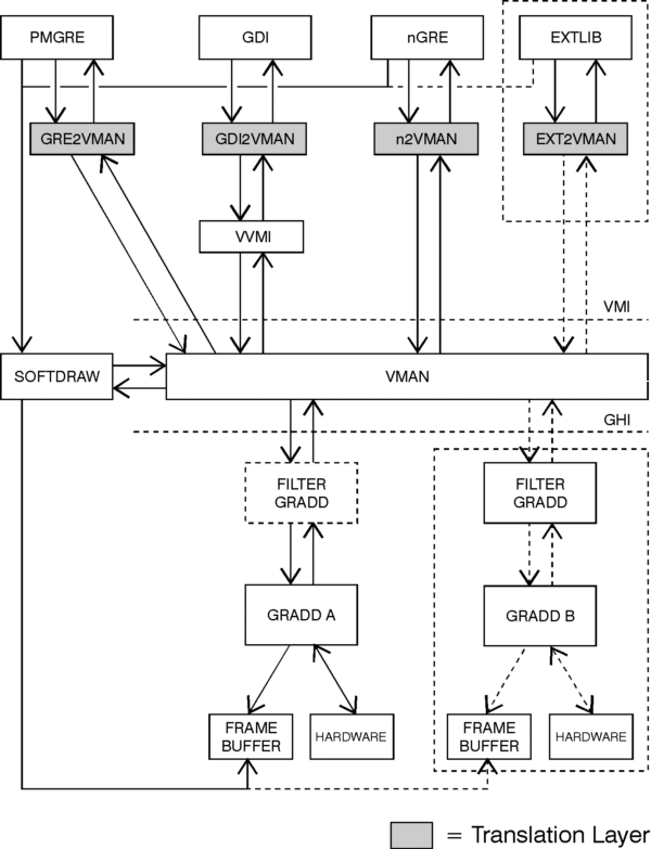 The GRADD model is composed of several components that coordinate the communication among each graphic subsystem and the available graphics hardware. The components include the following: