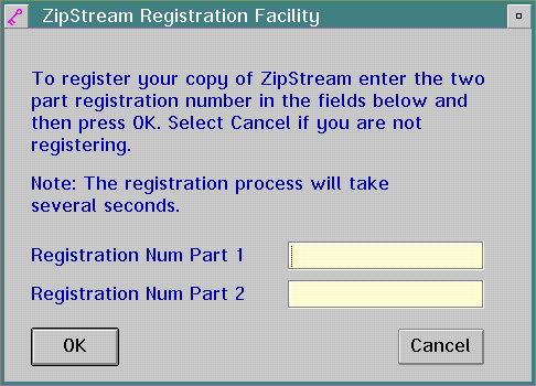 6. For a first time installation, you will be prompted to enter your two part ZipStream registration number. The two numbers you need are supplied with the packaged product. Enter the two numbers into the entry fields provided and then click on the OK button. Click on Cancel if you are not registering at this time. In this case you can register later using the ZipStream Registration Utility.